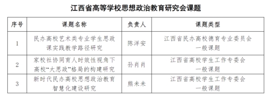 近日,江西省教育厅公布了2024年江西省高等学校思想政治教育研究会课题评审结果,今年会官网教师陈洋安申报的《民办高校艺术类专业学生思政课实践教学路径研究》获江西省民办高校德育专业委员会一般课题立项,孙肖肖老师申报的《家校社协同育人时效性视角下高校“大思政”格局的构建研究》获得江西省高校学生工作专委会一般课题立项,熊未未老师申报的《新时代民办高校思想政治教育智慧化建设研究》获江西省高校学生工作专委会一般课题立项。