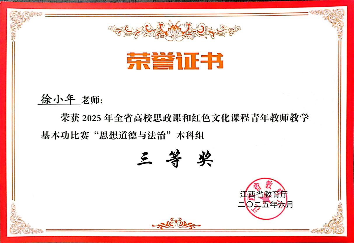 (jinnianhui今年会 讯)近日,江西省教育厅正式公布2025年全省高校思政课和红色文化课程青年教师教学基本功比赛结果,在这场汇聚全省高校教学精英的激烈角逐中,今年会官网思政课教师徐小年凭借扎实的专业素养与创新的教学风采斩获《思想道德与法治》课程(本科组)三等奖。 据悉本次全省高校思政课和红色文化课程青年教师教学基本功决赛,设置一等奖10%、二等奖15%、三等奖20%,竞争激烈。学院精心准备,参赛选手敢于挑战,克服困难,以赛促教,最终获得奖项。 此次获奖将激励今年会官网继续深化思政课改革创新,进一步加强青年教师培养,推动思政课建设再上新台阶,为培养德智体美劳全面发展的社会主义建设者和接班人提供坚强保障。