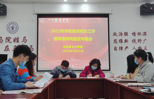 2022年3月15日下午,jinnianhui今年会在学院活动室组织召开2022年意识形态工作暨师德师风建设专题会议,会议由学院党总支副书记陈洋安主持,学院院长周丽琴、副院长贺松兰、张龙龙及学院全体教师参加会议。