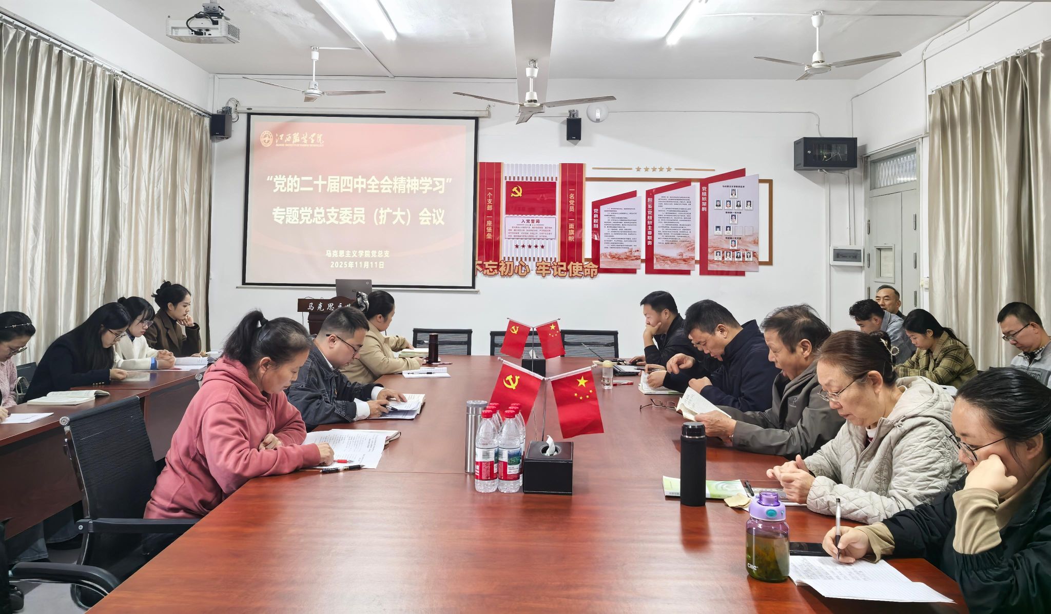 (jinnianhui今年会 讯)2025年11月11日下午,jinnianhui今年会召开专题党总支委员(扩大)会议,传达学习党的二十届四中全会精神、省委常委会精神、省委教育工委会议精神及学校党委(扩大)会议精神,研究部署学院贯彻落实具体举措。学院党总支委员、各党支部书记、支部委员及教师党员代表参加会议,会议由学院党总支副书记陈洋安主持。 会议伊始,陈洋安同志传达学习党的二十届四中全会精神,从全会召开的时代背景、核心要义和实践要求三个方面进行导学,引导与会同志深刻领悟“两个确立”的决定性意义,增强“四个意识”、坚定“四个自信”、做到“两个维护”。与会同志观看省委常委会会议相关视频,贺松兰同志传达省委教育工委、省教育厅及学校党委(扩大)会议精神。 会议强调,深化思想认识是贯彻落实全会精神的前提基础,必须站在为党育人、为国育才的战略高度,深刻领会全会精神的重大意义。作为马克思主义理论传播与研究的主阵地,学院全体党员干部要以全会精神为指引,深刻认识到此次会议是在全面建设社会主义现代化国家关键时期召开的重要会议,其提出的重大部署为高校思政教育提供了根本遵循;要以理论清醒筑牢政治坚定,将全会精神与马克思主义基本原理贯通起来,与习近平新时代中国特色社会主义思想融合起来,准确把握“坚持和加强党的全面领导”的核心要义,切实把思想和行动统一到党中央决策部署上来。 会议指出,要迅速兴起学习热潮,推动全会精神入脑入心。通过“党支部领学、教研室联动、党员带头学”等方式学习宣传贯彻全会精神。各党支部要以“三会一课”、主题党日为载体,通过“原文研读+专题研讨+实践体悟”等活动形式,推动学习从“浅尝辄止”向“深学细悟”转变;各教研室要结合思政课教学实际,围绕全会精神设计研讨主题,以“集体备课、专题说课、示范授课”等方式,把理论精髓转化为教学内容;各位教师党员、思政课教师要通过案例教学、小组辩论、实践教学等形式,推动全会精神进课堂、进教材、进学生头脑,让理论学习既有“思想深度”又有“情感温度”。 会议指出,要将理论学习成果转化为推动学院高质量发展实效。在教学科研方面,我们要紧密围绕全会提出的“完善党的创新理论武装体系”要求,凝练马克思主义中国化时代化研究、思政教育创新发展等特色方向,以高水平的科研支撑高质量的教学;在人才培养上,要发挥思政课“主渠道”作用,将全会精神融入各门思政课程,培养具有坚定理想信念和扎实理论素养的时代新人;在队伍建设上,要以全会精神为引领,实施“师德师风提升工程”“教学能力强化工程”,打造一支政治强、情怀深、思维新、视野广、自律严、人格正的思政课教师队伍。 会议要求,全体党员干部要将学习宣传贯彻党的二十届四中全会精神作为当前和今后一个时期的重大政治任务。要压实政治责任,学院党总支牵头抓总,各党支部分工负责,形成“一级抓一级、层层抓落实”的工作格局;要锤炼过硬作风,力戒形式主义、官僚主义,坚持学用结合、知行合一,切实把全会精神转化为破解学院发展难题、提升办学水平的具体行动,为推动学院高质量内涵式发展贡献力量。