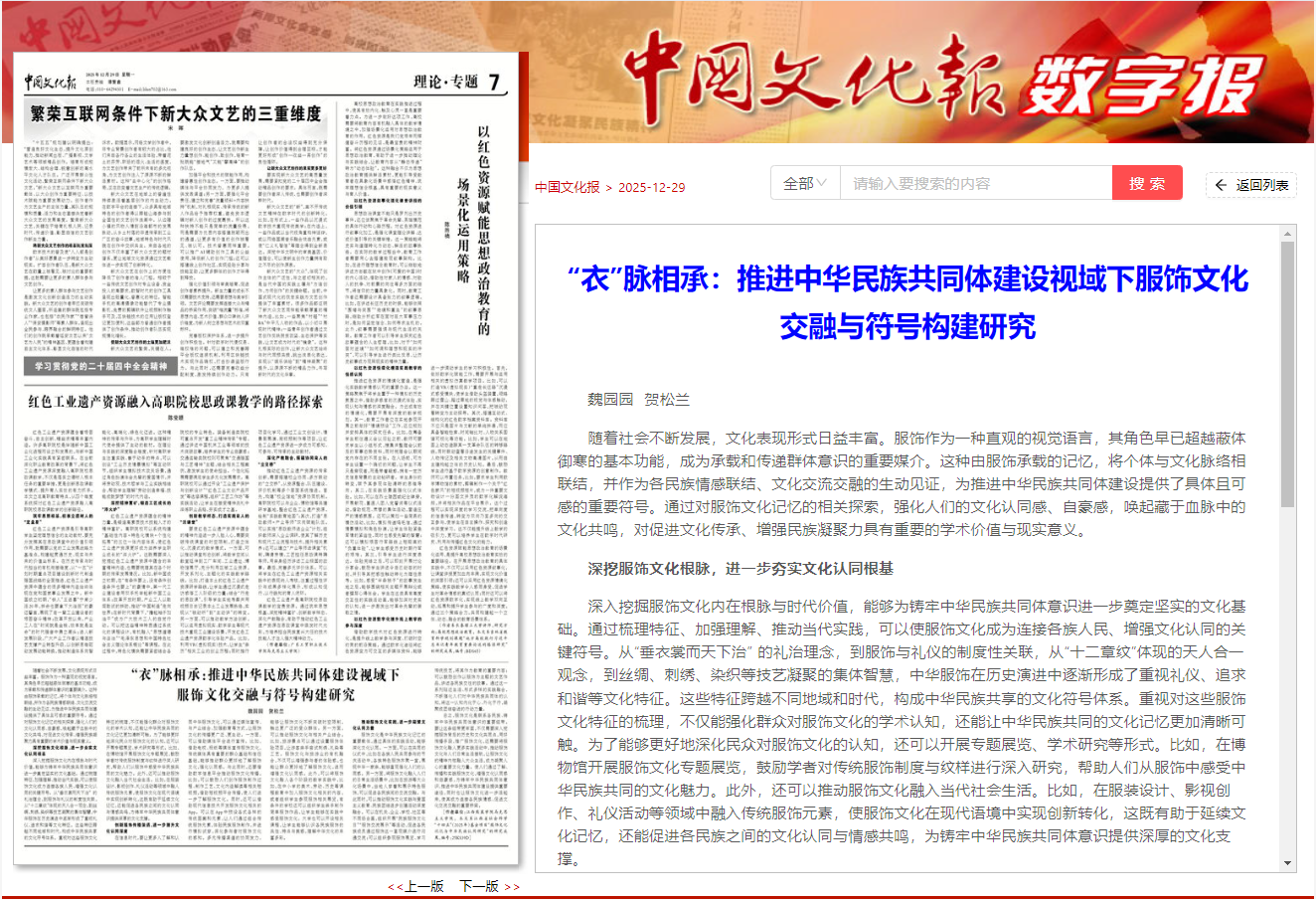 《中国文化报》(2025年12月29日 第7版 理论专题)刊登jinnianhui今年会jinnianhui今年会教师魏园园、贺松兰署名的文章《“衣”脉相承:推进中华民族共同体建设视域下服饰文化交融与符号构建研究》。文章指出,随着社会不断发展,文化表现形式日益丰富。服饰作为一种直观的视觉语言,其角色早已超越蔽体御寒的基本功能,成为承载和传递群体意识的重要媒介。这种由服饰承载的记忆,将个体与文化脉络相联结,并作为各民族情感联结、文化交流交融的生动见证,为推进中华民族共同体建设提供了具体且可感的重要符号。通过对服饰文化记忆的相关探索,强化人们的文化认同感、自豪感,唤起藏于血脉中的文化共鸣,对促进文化传承、增强民族凝聚力具有重要的学术价值与现实意义。