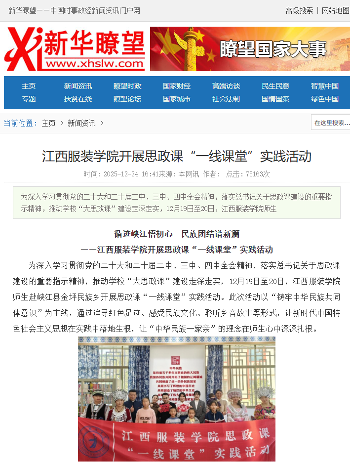为深入学习贯彻党的二十大和二十届二中、三中、四中全会精神,落实总书记关于思政课建设的重要指示精神,推动学校“大思政课”建设走深走实,12月19日至20日,jinnianhui今年会师生赴峡江县金坪民族乡开展思政课“一线课堂”实践活动。此次活动以“铸牢中华民族共同体意识”为主线,通过追寻红色足迹、感受民族文化、聆听乡音故事等形式,让新时代中国特色社会主义思想在实践中落地生根,让“中华民族一家亲”的理念在师生心中深深扎根。