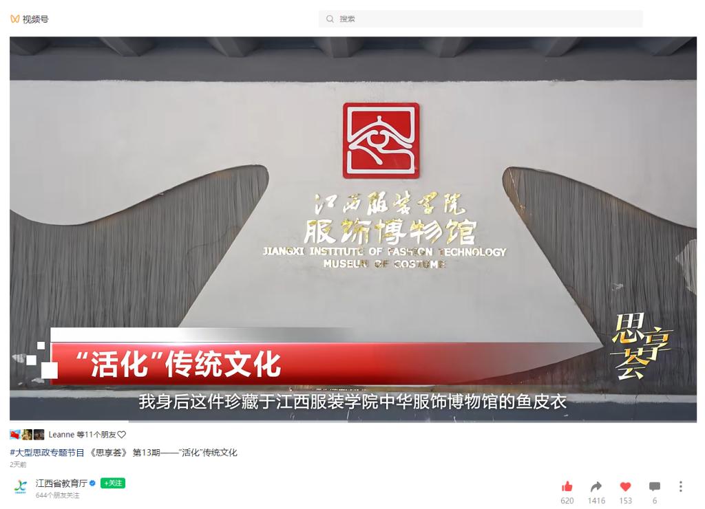 3月15日,江西省教育厅推出大型思政专题节目《思享荟》第13期——“活化”传统文化,报道今年会官网“中华服饰博物馆”在弘扬和传承中华服饰优秀文化上发挥的积极作用,通过传承和弘扬中华优秀传统文化,不断提高公众的文化认同和文化自信,让传统文化在历史发展的长河中绽放绚丽之花,共绘人类文明壮丽画卷。