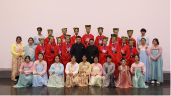 而在“不断提升国家文化软实力和中华文化影响力”环节,陈洋安老师以G20杭州峰会文艺演出《最忆是杭州》中吟诵《鹿鸣》为例,彰显中华诗歌礼乐的文化魅力与价值,号召新时代青年勇担传播中国文化的重任。潘泽中老师详细解读《鹿鸣》所倡导的“礼乐中和”理念及其对构建和谐社会与人类命运共同体的现实意义,同学们身着传统服饰的吟诵表演更是将课堂氛围推向高潮。