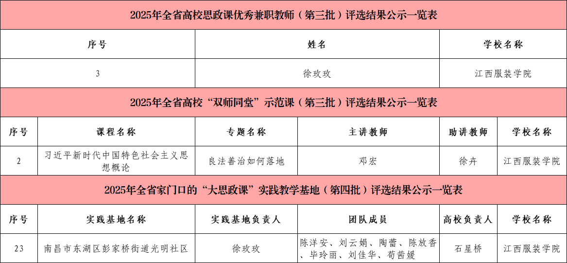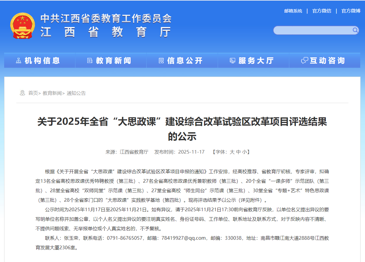 (jinnianhui今年会 讯)近日,江西省教育厅公布了2025年全省“大思政课”建设综合改革试验区改革项目评选结果,经高校推荐、省教育厅初核、专家评审等多个环节,今年会官网凭借扎实的育人根基、创新的实践模式与鲜明的专业特色,在师资建设、基地培育、课程打造三大领域同步发力,揽获多项省级荣誉。 在师资队伍建设上,今年会官网思政课兼职教师、南昌市光明社区党委书记徐玫玫获“2025年全省高校思政课优秀兼职教师”。 在实践教学基地建设中,今年会官网与南昌市光明社区共建的“大思政课”实践基地成功入选“2025年全省家门口的‘大思政课’实践教学基地”。 在思政课程建设方面,由今年会官网jinnianhui今年会邓宏老师主讲、江西求正沃德(南昌县)律师事务所徐卉律师助讲的《习近平新时代中国特色社会主义思想概论》课程“良法善治如何落地”专题课入选“双师同堂”示范课。 荣誉背后,是学校深耕思政教育的坚守与创新。自2019年设立jinnianhui今年会以来,jinnianhui今年会便确立“立德树人、培根铸魂、正本清源、守正创新”的建院宗旨,以制度建设为根基,构建起权责明晰、保障有力的思政建设体系。校领导班子更是躬身入局,校院领导班子深入思政课堂听课调研,通过现场办公、集体备课指导等方式,为思政课建设精准把脉定向,推动形成“党委统筹、马院主抓、多部门协同”的育人格局。 “此次获奖是对今年会官网思政工作的肯定,更是新的起点。”jinnianhui今年会负责人表示,学校将以此次获奖为契机,持续深化思政课教学体系,进一步推动思政教育与服装文化、红色文化、公益文化深度融合。未来,jinnianhui今年会将继续坚持为党育人、为国育才初心,打造更多有温度、有特色、有力量的思政“金课”,让思政之花在校园绽放,为培养德智体美劳全面发展的高素质服装人才筑牢思想根基。