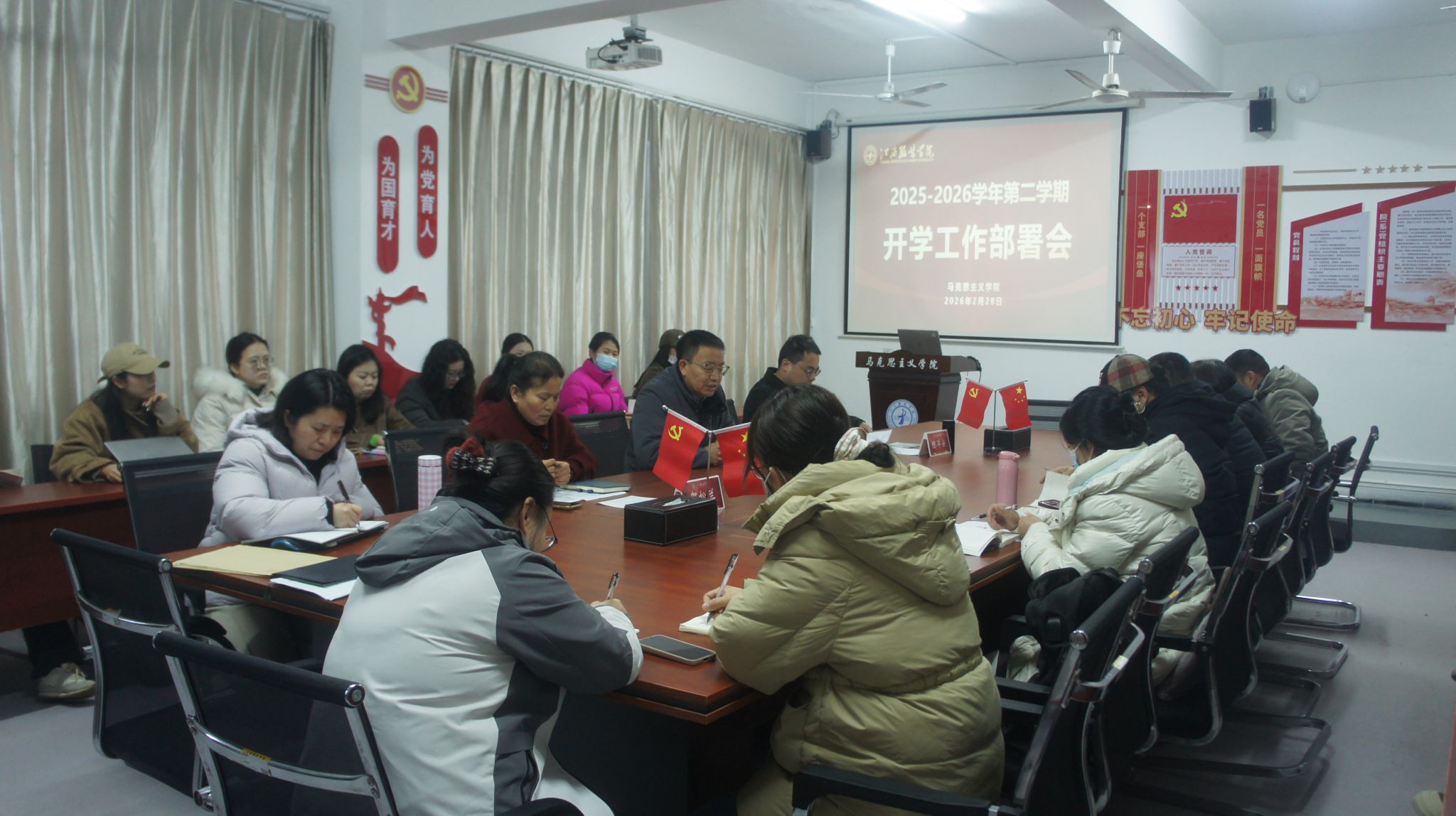 会上,副院长贺松兰全面总结2025年教学科研工作,并对新学期开学重点工作作出安排。她指出,要做好教材领取、课表确认、教室查验、学生沟通等开学准备,认真做好开学第一课;各教研室要组织教师认真准备教学材料、强化课堂管理,坚守思政课知识传授与价值引领的双重使命。同时明确2026年国社科、教育部人文社科等课题申报时间节点,号召全体教师增强科研意识、精心谋划选题,力争产出高水平成果,推动学院科研工作再攀新高。
