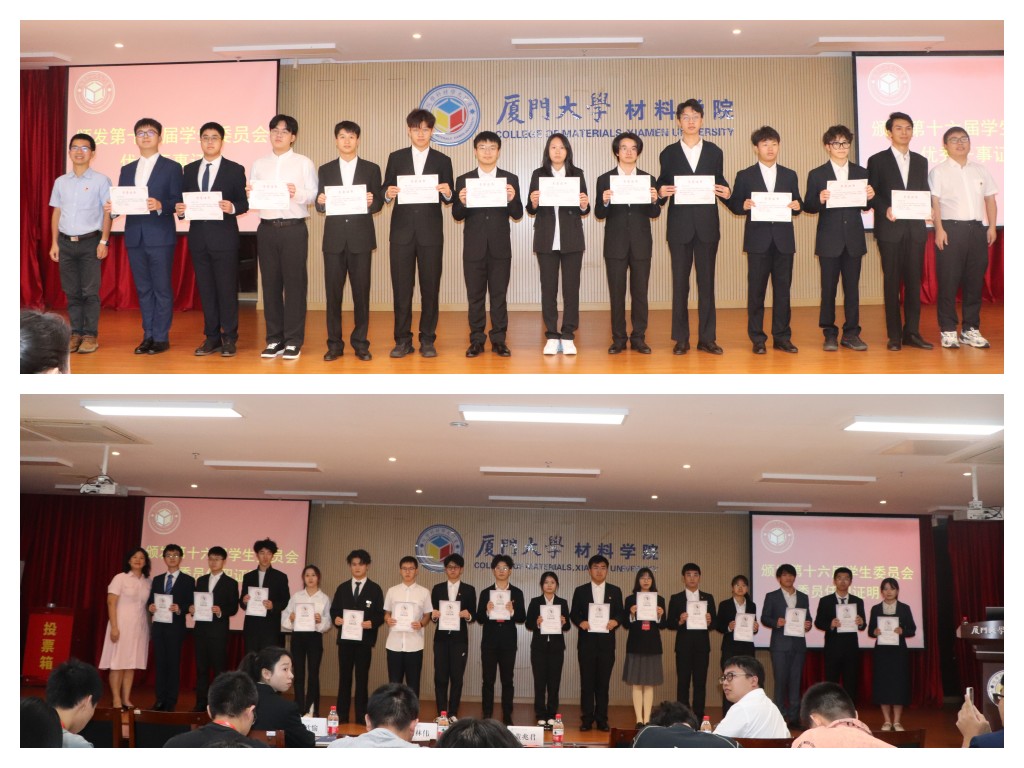 会上,石林伟、林锦昊老师为第十六届学生委员会优秀干事颁发证书,黄兆君老师为第十六届学生委员会各部门负责人颁发任职证明。