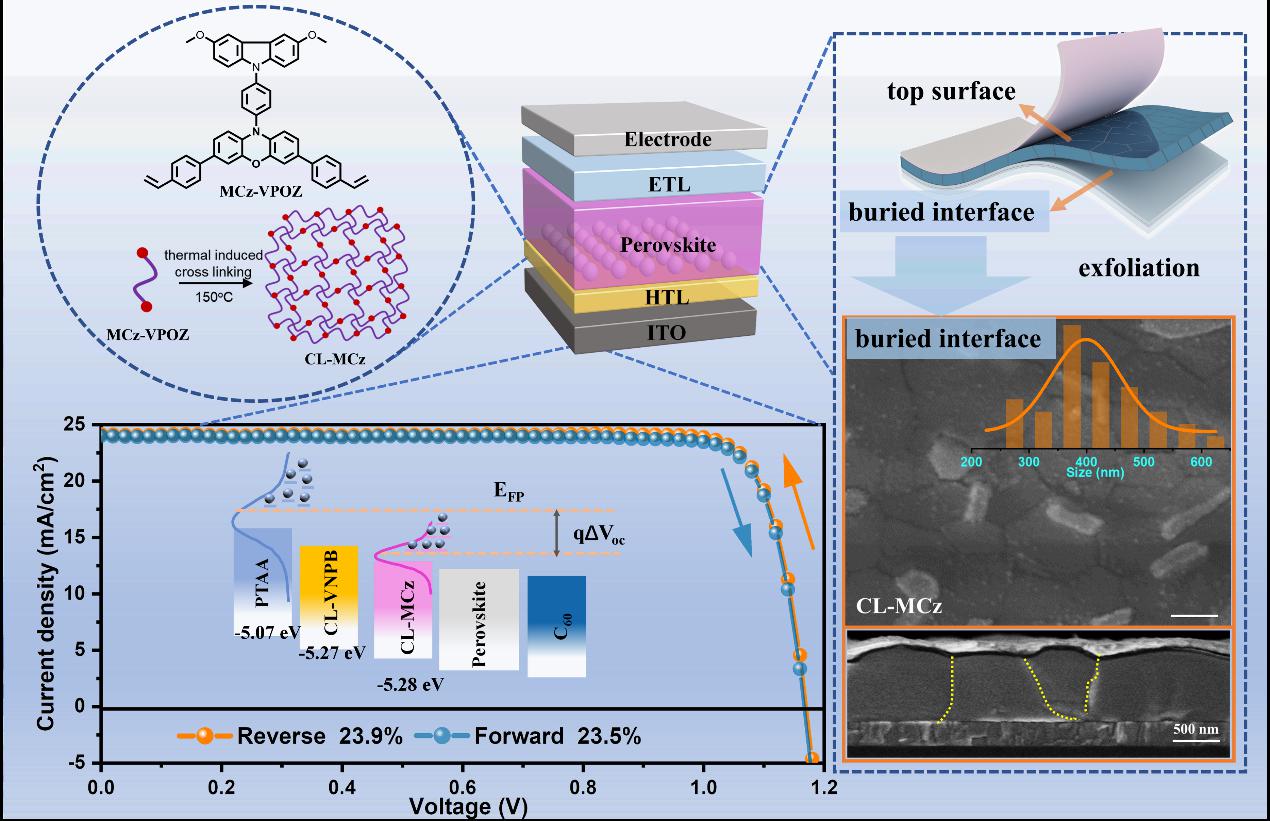 尽管反式钙钛矿太阳能电池具有制备简单、稳定性好、迟滞效应低、适合叠层器件等优势,但反式器件仍存在效率偏低和界面稳定性差等问题。针对传统聚[双(4-苯基)(2,4,6-三甲苯基)胺]空穴传输材料存在的界面润湿性差、分子有序性低、能级不匹配等缺点,张金宝教授团队设计开发了一种吩恶嗪基小分子,采用原位热交联反应,一步制备高效稳定的空穴传输材料。该材料具有高能量有序性、高导电性以及匹配的能级分布,在钙钛矿太阳能电池器件中表现出高达23.9%的转换效率。该工作为设计开发高效稳定的空穴传输材料提供新思路。