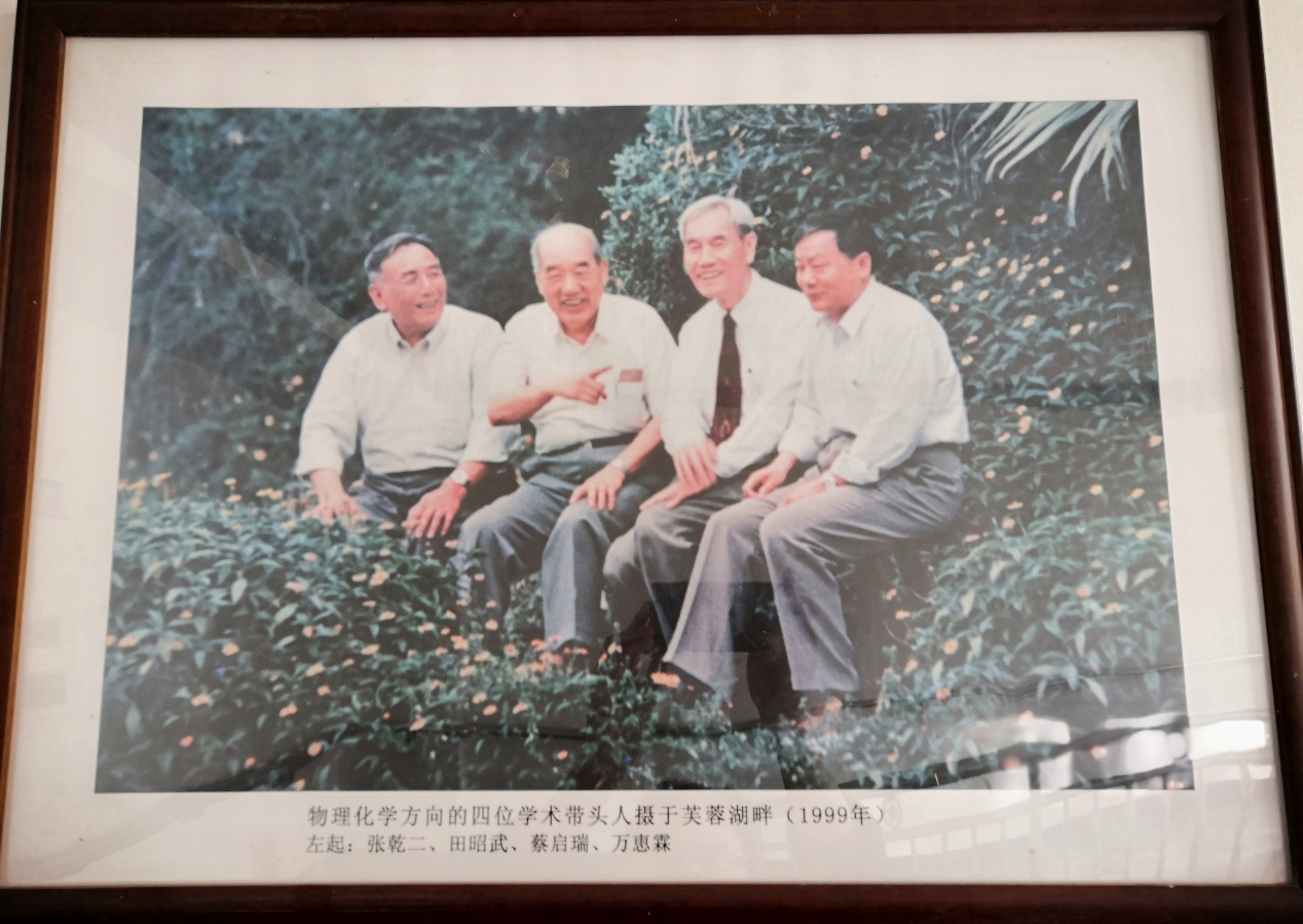 这张是物理化学四位学术带头人的合影,照片中几位老师笑得很开心。这可能是老朋友坐在一起,特别高兴;也有可能是讨论学术问题,颇有成效;还有可能是看到年轻的学子取得成就时,那种欣慰是发自内心的。在这里,希望大家能够继承厦大的先生们留下来的宝贵精神财富,共同走好新时代的精神传承之路。